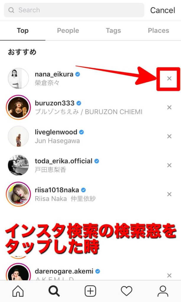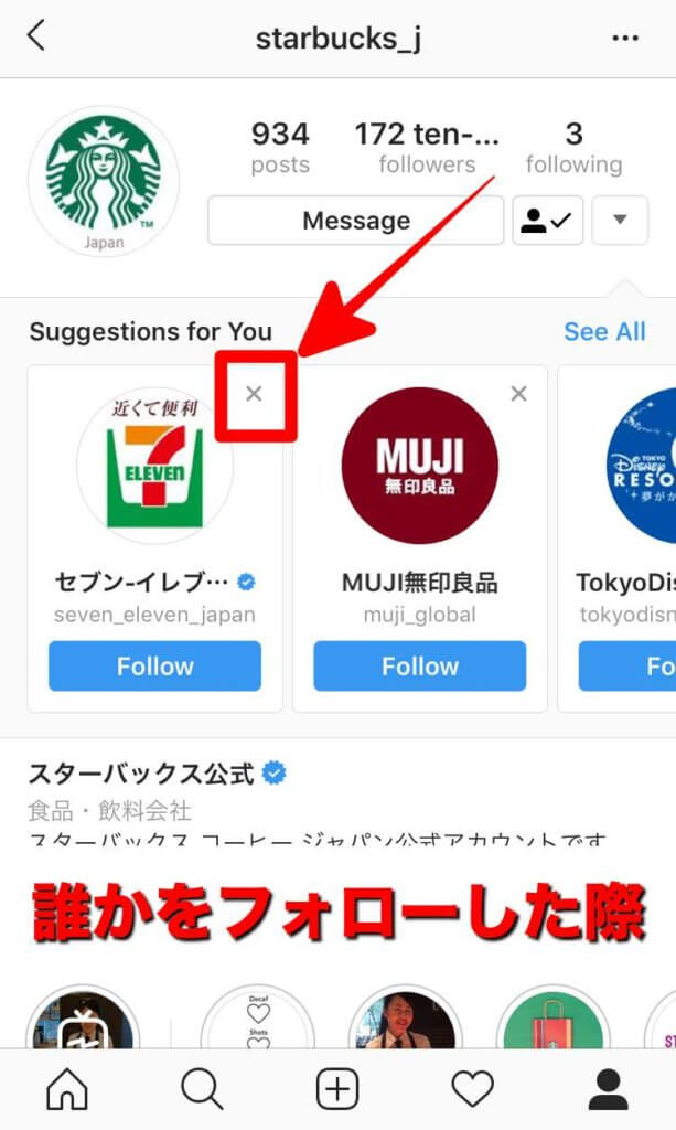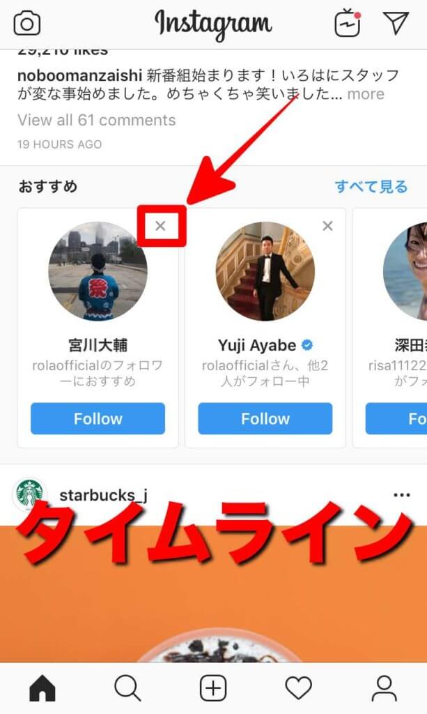 いずれの場合にも【おすすめ】ユーザーは表示されているアカウントの右上(または右側)に表示されている【×】をタップする事で非表示にする事ができます。